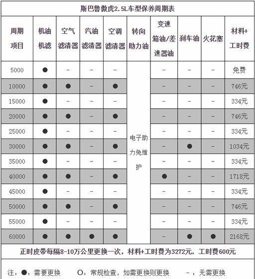 斯巴魯傲虎的保養周期及費用如下圖,傲虎的《保養手冊》標明,首保里程為5000公里,保養的間隔為5000公里/次,廠家還贈送了一次免費保養的優惠。我們下圖的數據是按照使用半合成機油計算,傲虎行駛6萬公里保養總費為8828元,在同級別SUV里面表現還是挺好的。